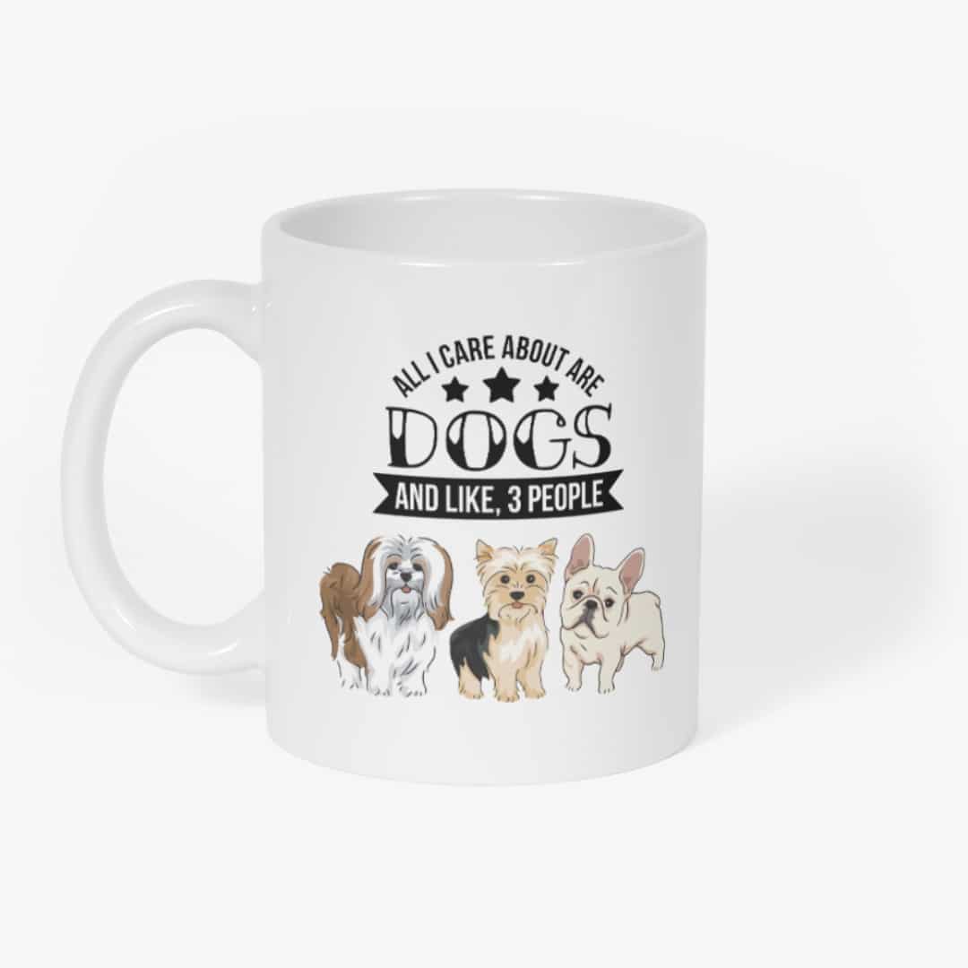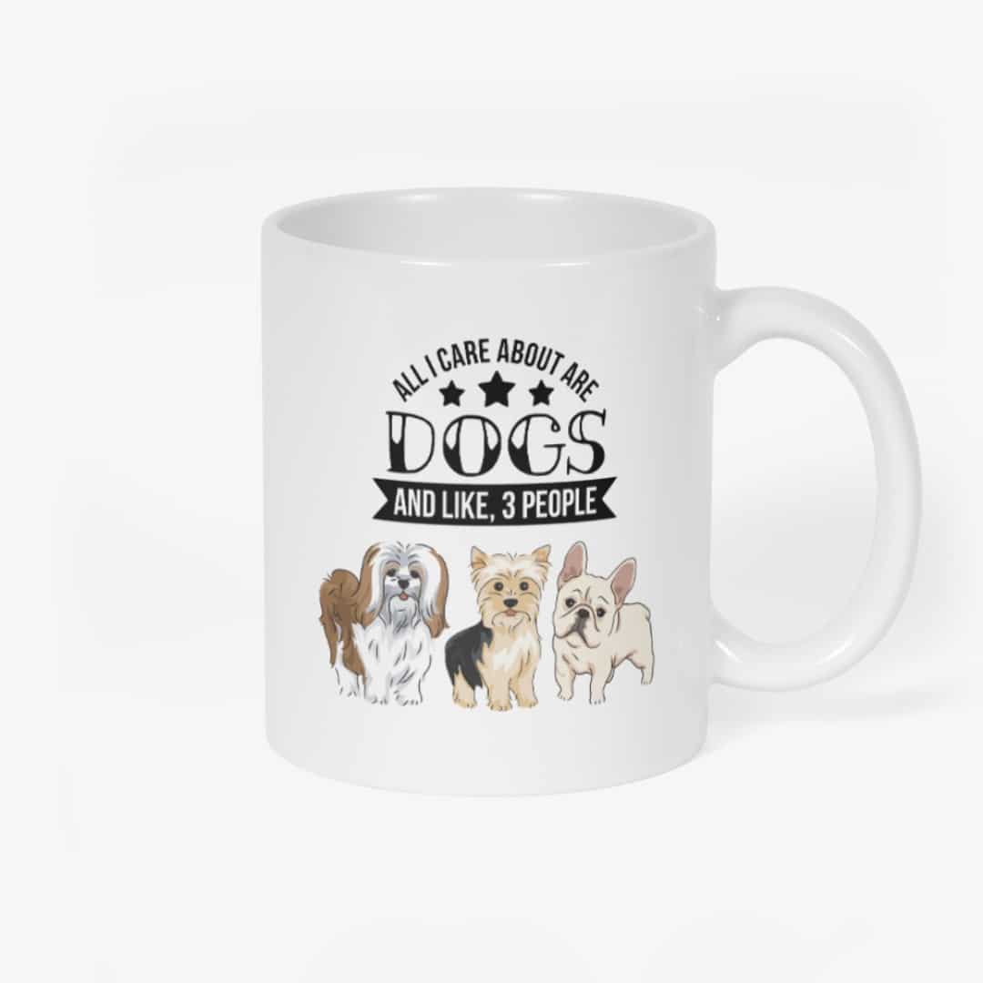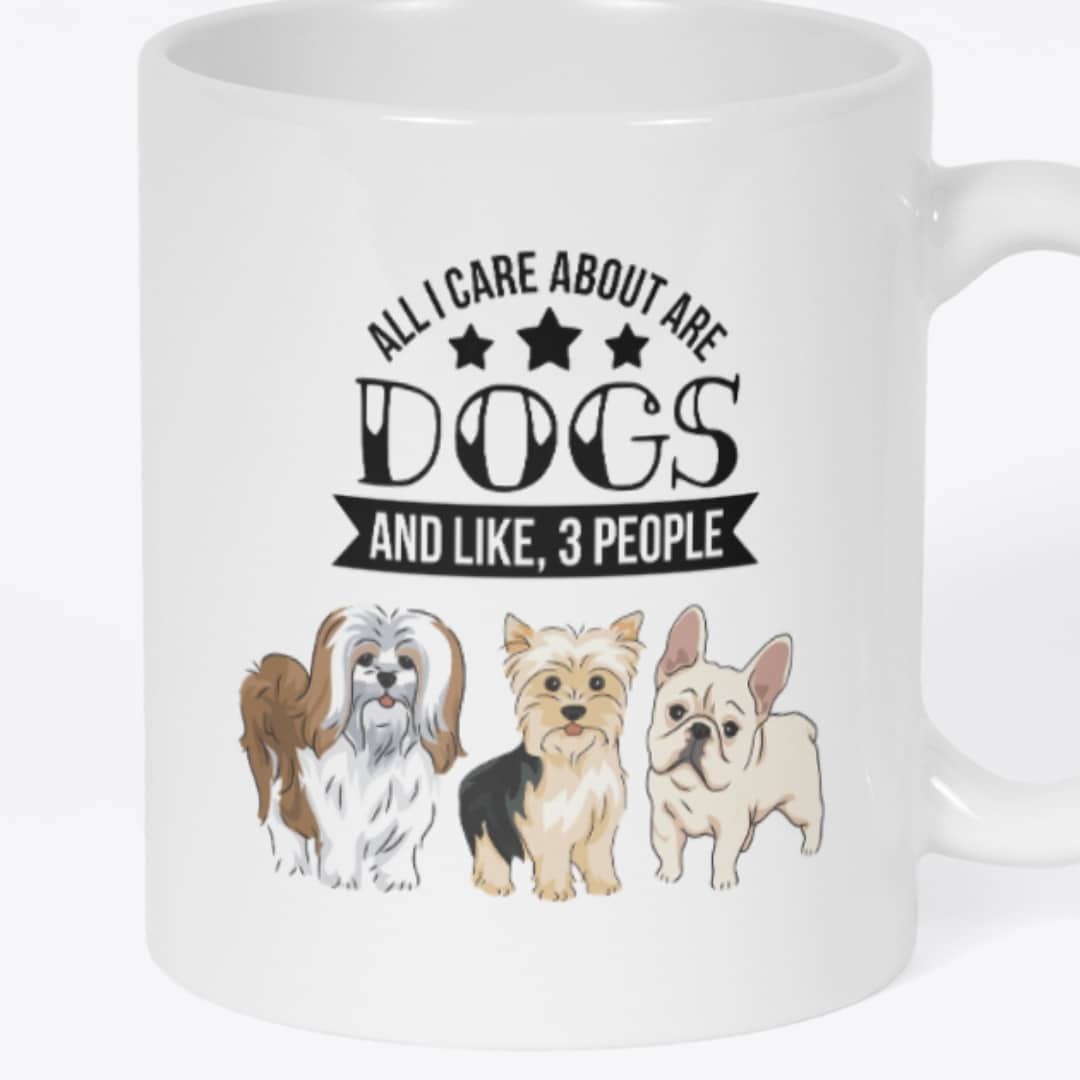 Care About Dogs Mug – People, not so much. Get this “All I care about are dogs and about 3 people” mug, to show what you REALLY feel!