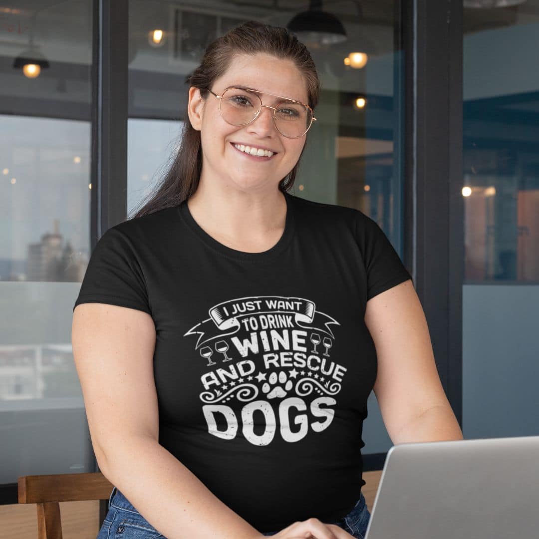 Woman Wearing Drink Wine & Rescue Dogs T-shirt - Black
